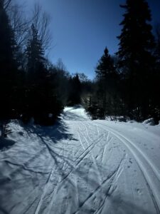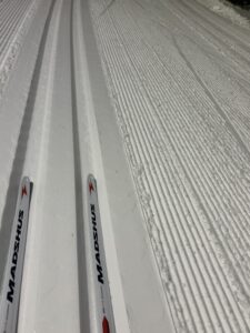 Well – there is no shortage of snow in the trails! The groomer is still ticking along, and tonight I groomed the 3k and the 5k with the intent to do the hills tomorrow!